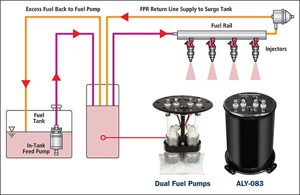 A surge tank setup provides consistent fuel delivery under extreme conditions, such as high lateral G-forces, and is an ideal choice for high-power applications.