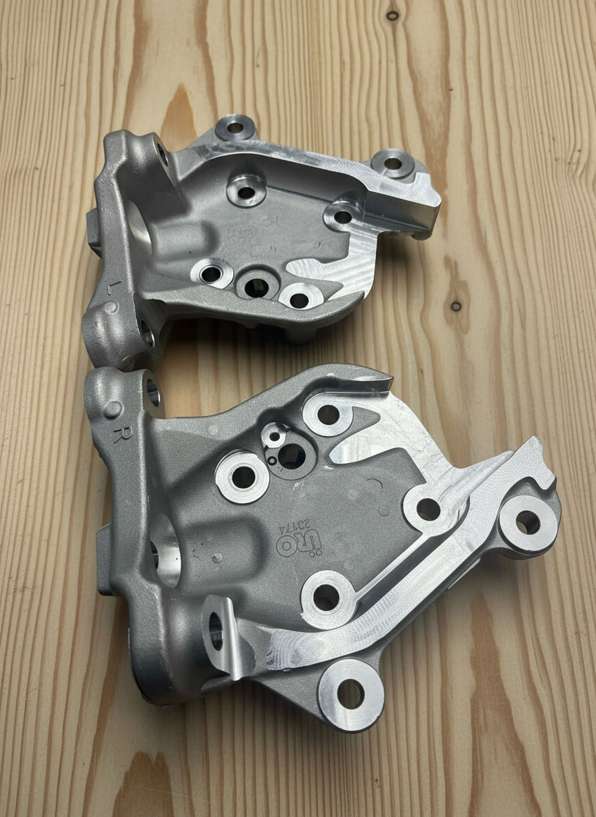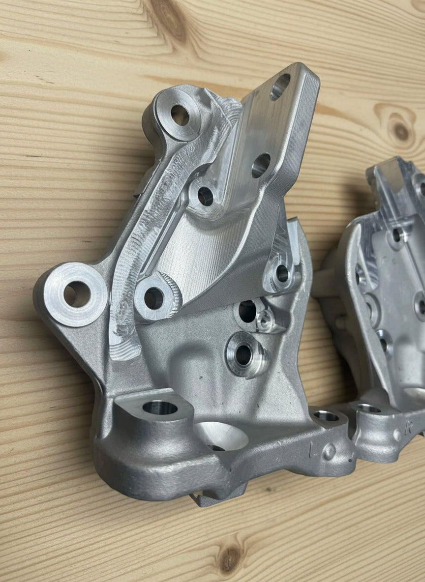 - Custom Billet Lower Mount – Bolts to the back of the hub mounting locations of a modified stock knuckle, securing the Mustang strut while maintaining factory suspension geometry.